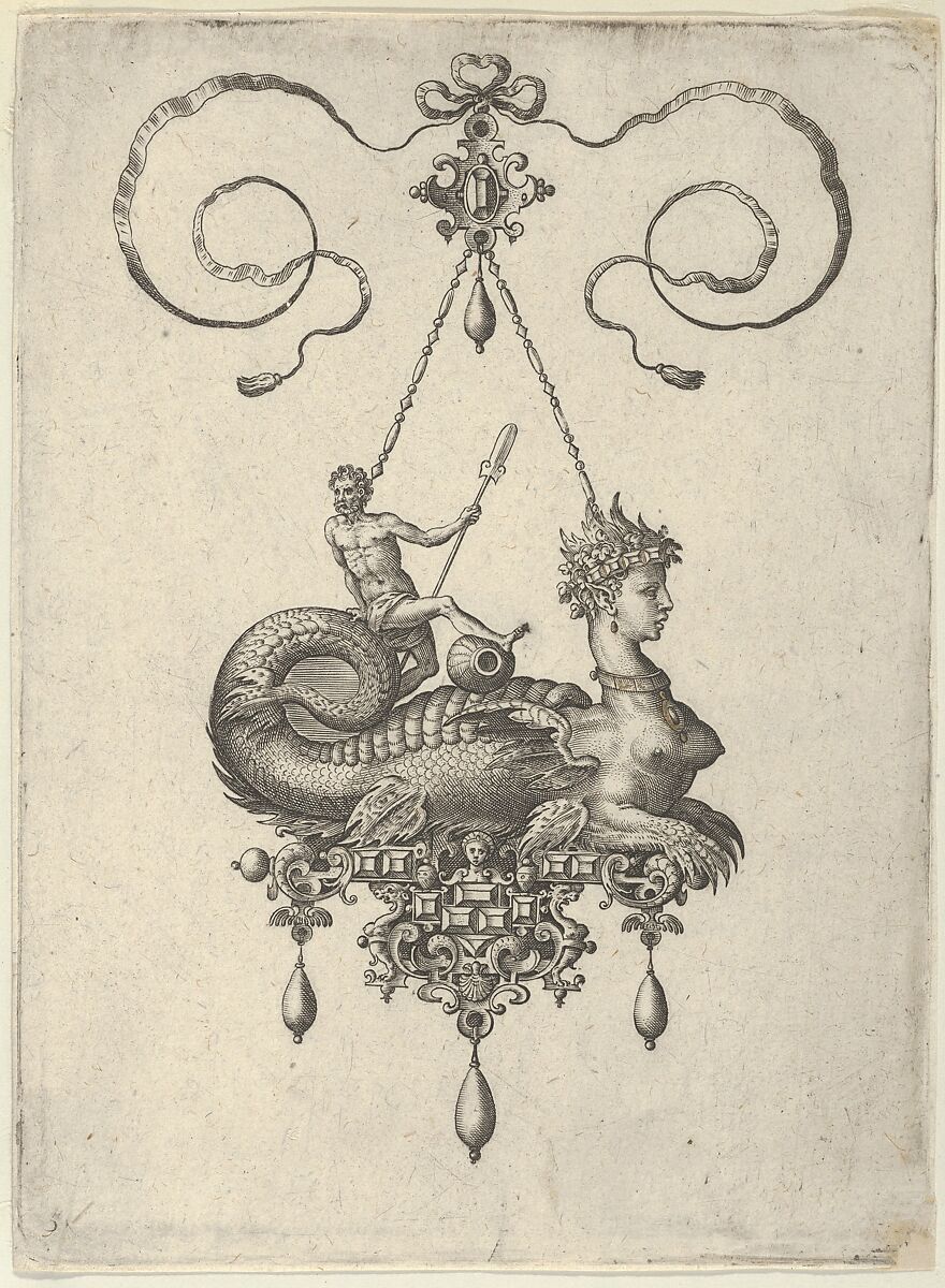 Vertical panel with a pendant in the shape of a sphinx with the body of a fish ridden by a male figure holding an oar in his left hand with a vase beneath his right leg. The ornament is suspended from a small jewelled motif tied with a ribbon at top. Plate 5 from a series of ten plates with pendant designs in the shape of sea monsters. The series, known as Designs for Pendants II, was engraved by Adriaen Collaert, after designs by his father, Jan Collaert I, who died in 1580. Jan Collaert I produced several series of pendant designs, including the prequel to this series, Designs for Pendants I. This print belongs to the first edition, published in Antwerp by Philips Galle in 1582.