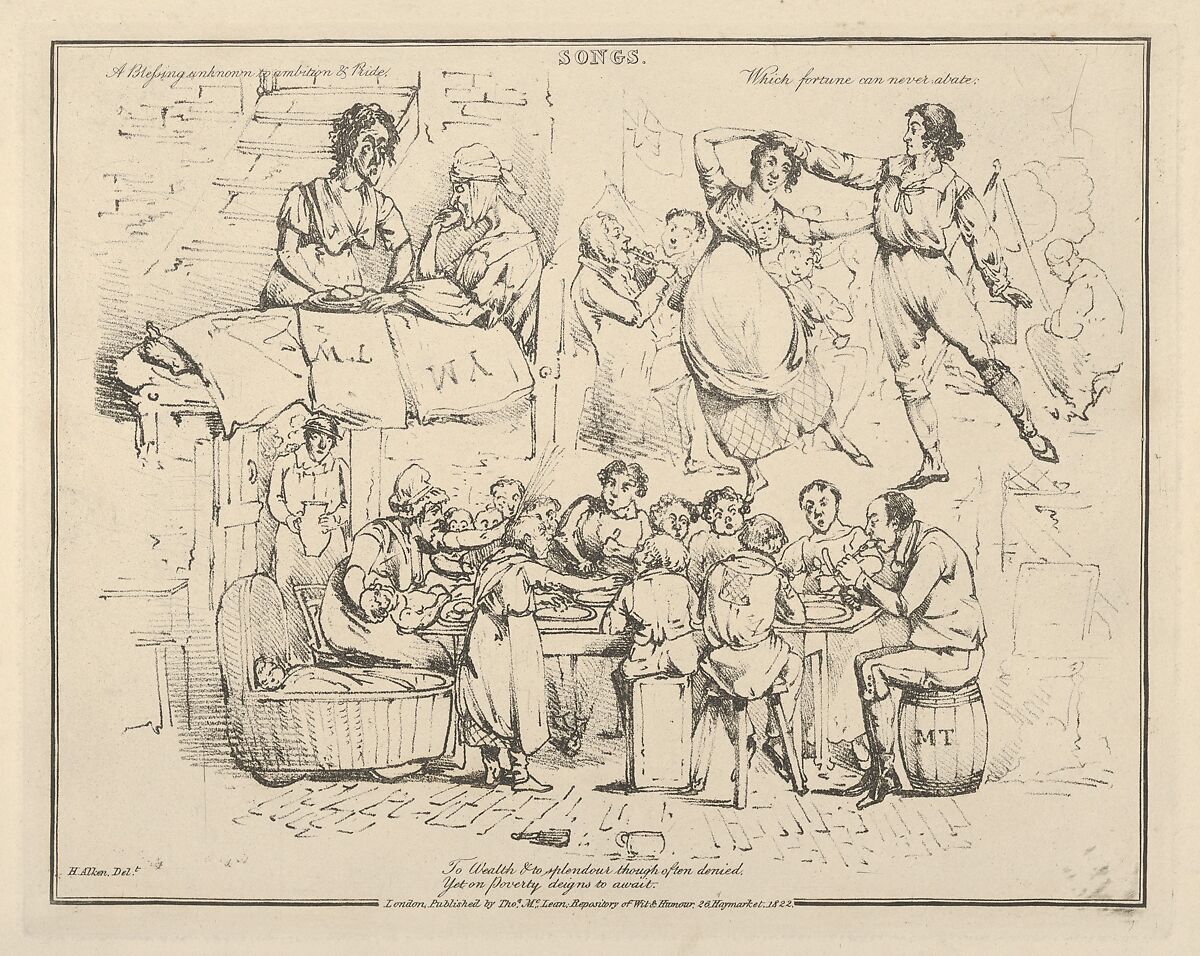 One sheet of a series of satires, designed as a song book. Composed of vignette scenes, each scene illustrating in a humourous fashion a single line from a popular song of the day. The imagery derives from hunting, shooting and horses, scenes from domestic life, fashion, town and country life, military and naval life.