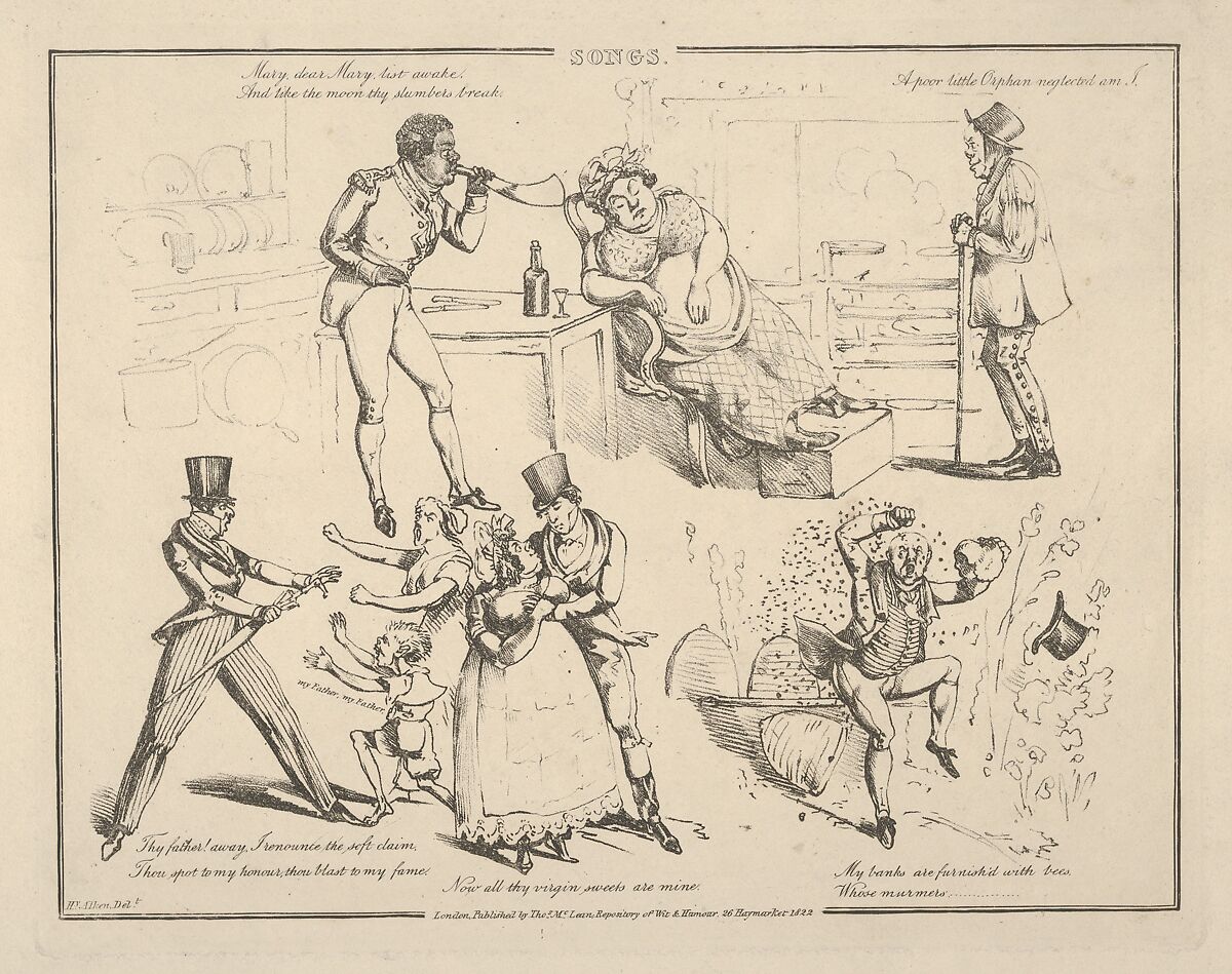 One sheet of a series of satires, designed as a song book. Composed of vignette scenes, each scene illustrating in a humourous fashion a single line from a popular song of the day. The imagery derives from hunting, shooting and horses, scenes from domestic life, fashion, town and country life, military and naval life.