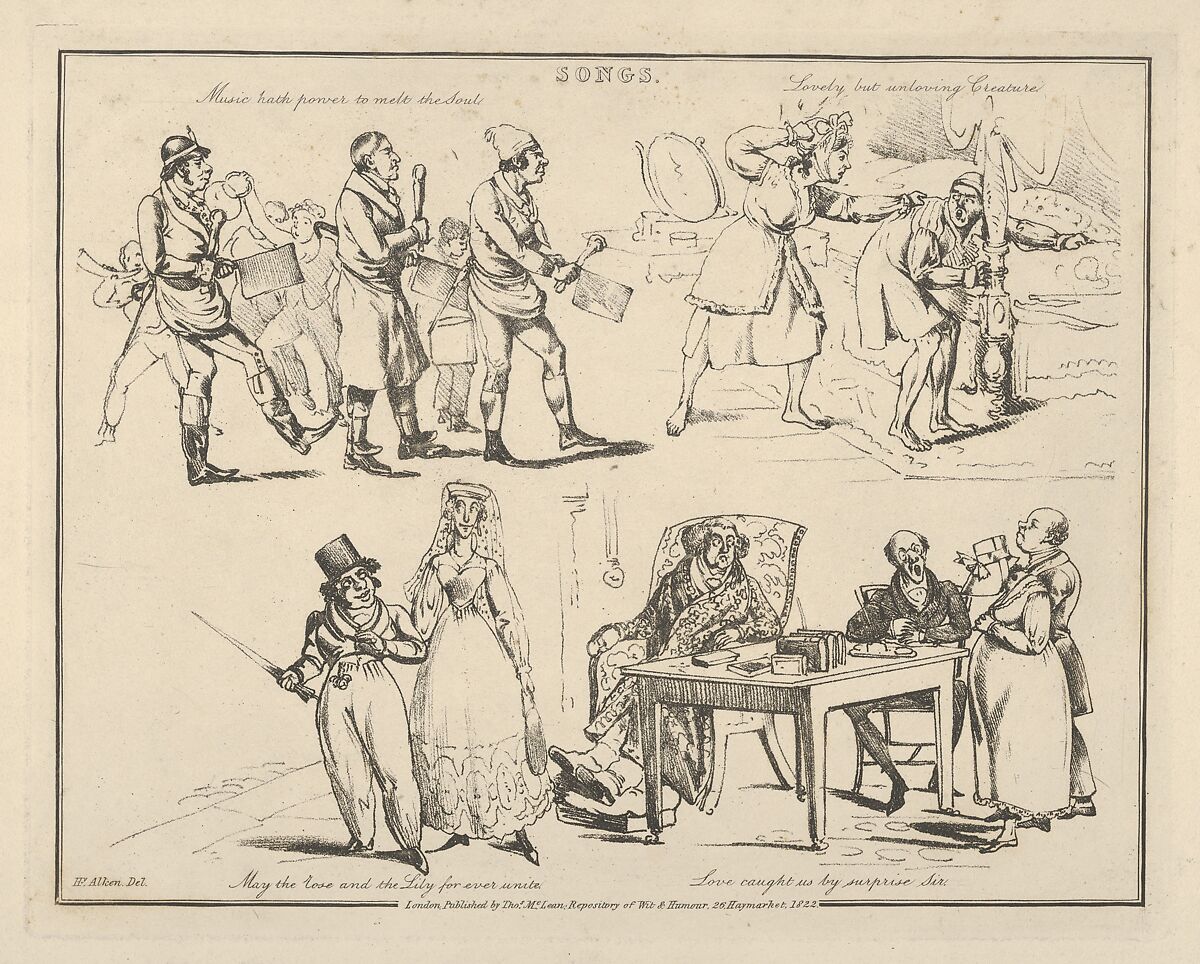 One sheet of a series of satires, designed as a song book. Composed of vignette scenes, each scene illustrating in a humourous fashion a single line from a popular song of the day. The imagery derives from hunting, shooting and horses, scenes from domestic life, fashion, town and country life, military and naval life.