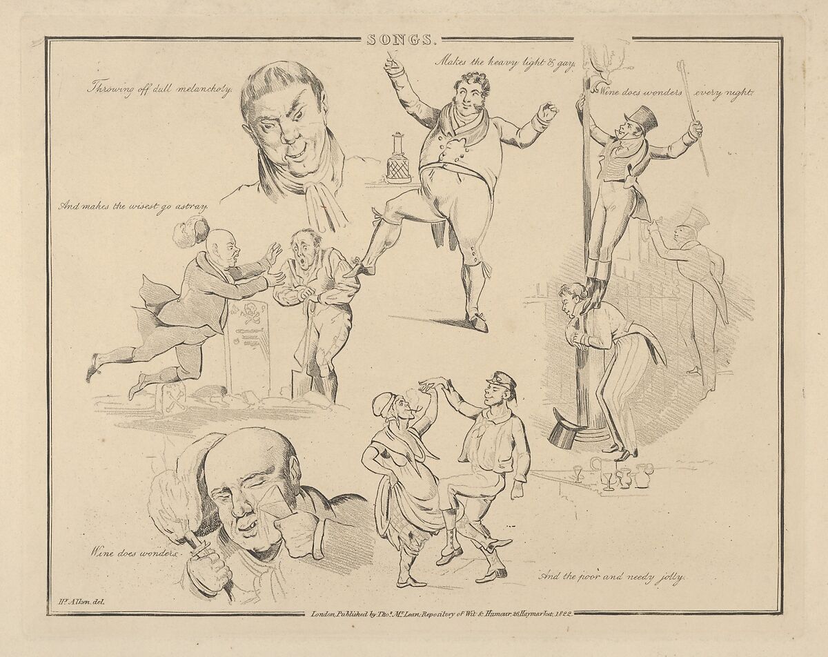 One sheet of a series of satires, designed as a song book. Composed of vignette scenes, each scene illustrating in a humourous fashion a single line from a popular song of the day. The imagery derives from hunting, shooting and horses, scenes from domestic life, fashion, town and country life, military and naval life.