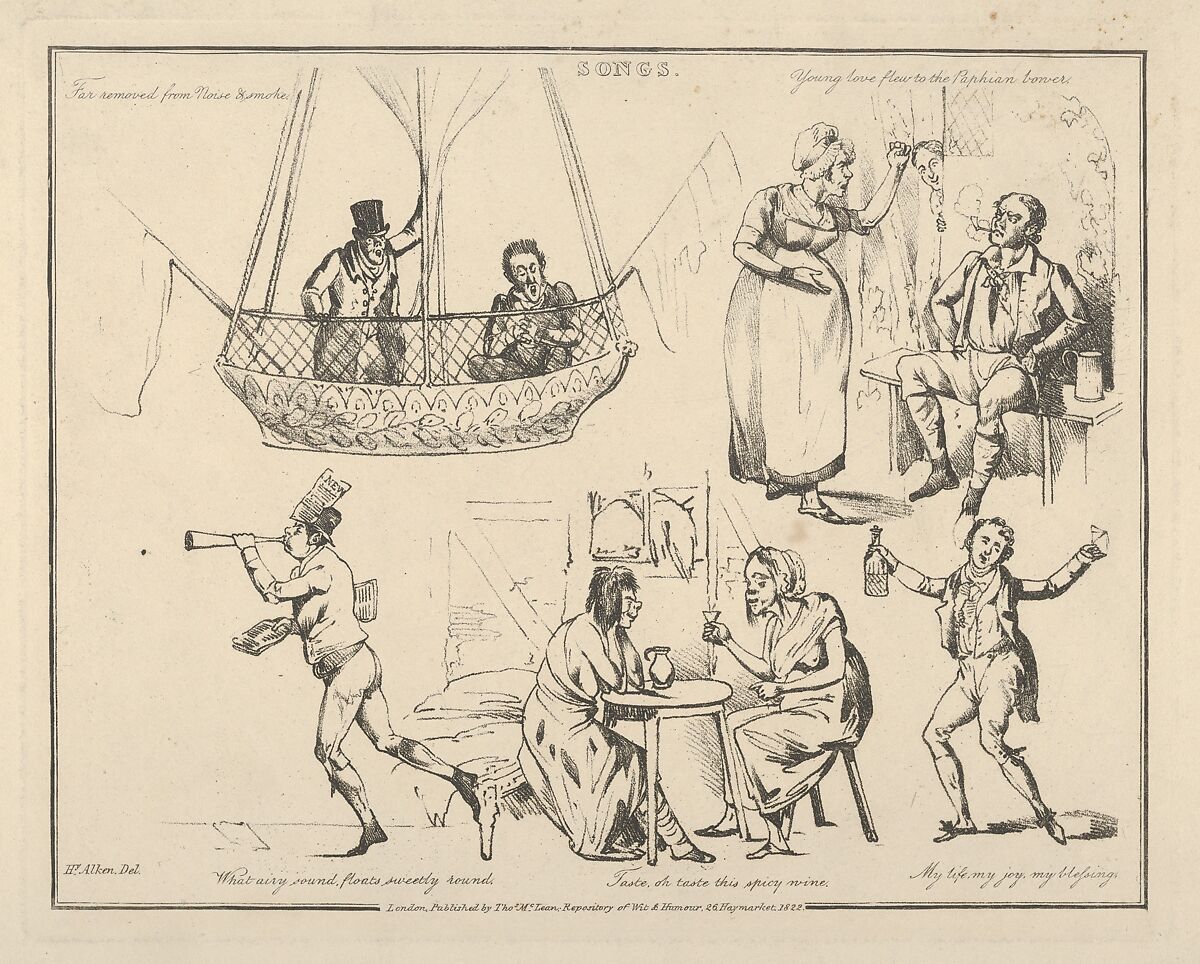 One sheet of a series of satires, designed as a song book. Composed of vignette scenes, each scene illustrating in a humourous fashion a single line from a popular song of the day. The imagery derives from hunting, shooting and horses, scenes from domestic life, fashion, town and country life, military and naval life.