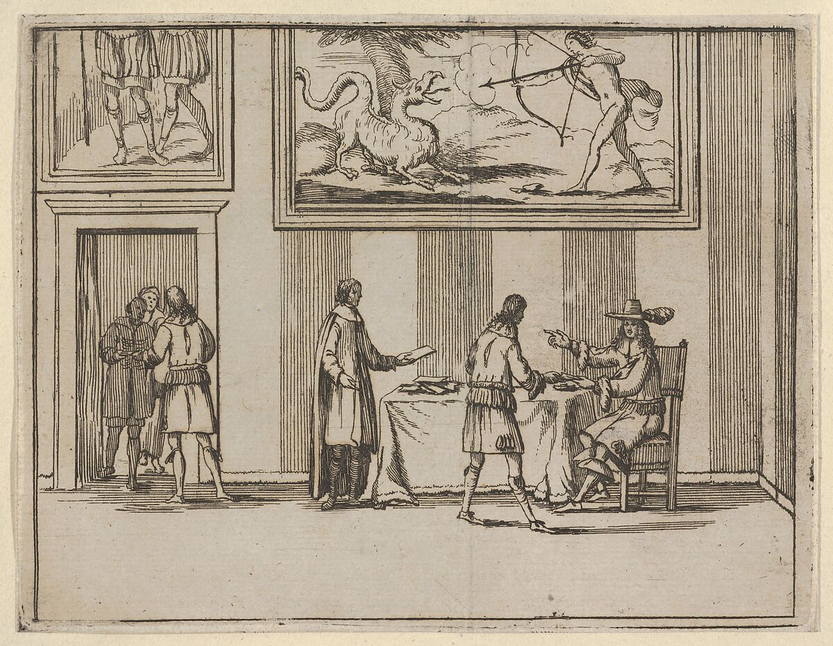 This print is from L'Idea di un Principe ed Eroe Cristiano in Francesco I d'Este, di Modena e Reggio Duca VIII [...] collected in an album of brown boards. Four prints are hinged on each page of the album with a seventeenth- or eighteenth-century inscription pasted beneath the print on the album page. The prints are etched in the manner of Callot and illustrate Francesco I d'Este's virtuous nature as a ruler in battle, in religious matters, and in daily life. Three of the prints are signed by Jean Sauvé, who presumably worked with Fenice on the execution of the illustrations for this book. There are sixty-seven copper plates and forty-five preparatory drawings in the Museo Civico di Modena.
