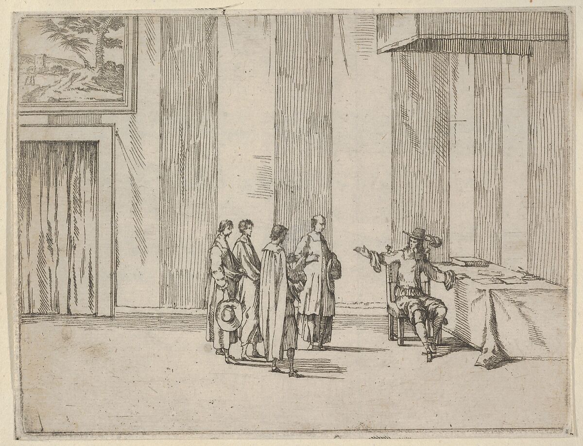 This print is from L'Idea di un Principe ed Eroe Cristiano in Francesco I d'Este, di Modena e Reggio Duca VIII [...] collected in an album of brown boards. Four prints are hinged on each page of the album with a seventeenth- or eighteenth-century inscription pasted beneath the print on the album page. The prints are etched in the manner of Callot and illustrate Francesco I d'Este's virtuous nature as a ruler in battle, in religious matters, and in daily life. Three of the prints are signed by Jean Sauvé, who presumably worked with Fenice on the execution of the illustrations for this book. There are sixty-seven copper plates and forty-five preparatory drawings in the Museo Civico di Modena.