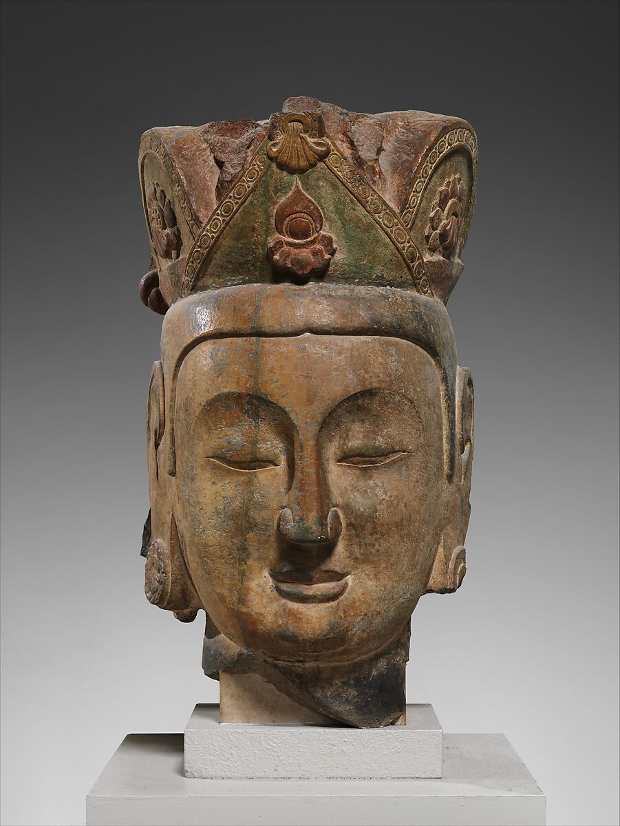 This head once belonged to a towering bodhisattva who presided over the entrance to the Central Cave at Northern Xiangtangshan. This site, which consists of only three cave temples with colossal figural sculptures, was once strategically located on the route between the capital at Ye and Jinyang, in Shanxi province. At the beginning of the Northern Qi period, it may have been a place for meditation or other Buddhist activities.