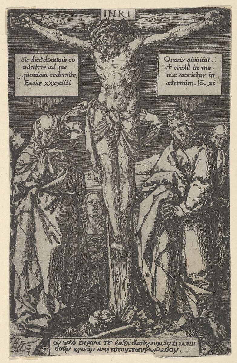 Christ on the Cross, with the Virgin standing at far left and Mary Magdalen kneeling at her right. To the right of Christ, Saint John, with the head of Mary visible behind him at far right. At bottom left of the cross, the skull.