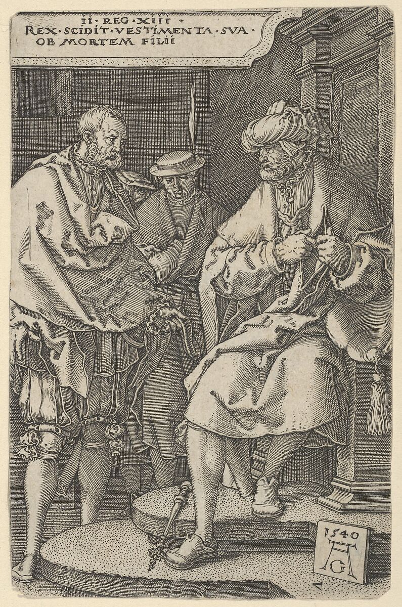 David, seated on a throne at right tears at his cloak, while Jonadab and a servant stand at left. Based on 2 Samuel 13:31. Plate 7 from a series of seven plates with the Story of Amnon and Tamar.