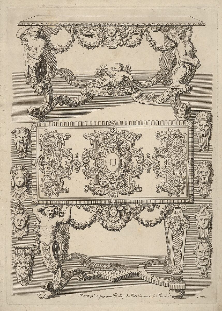 Daniel Marot was born and raised in France, but in 1685 he left his native country and settled in The Hague (The Netherlands). He received various commissions of high stature from Stadhouder Willem, Prince of Orange, who would soon become King William III of England in 1689. From the late 17th century onwards, Marot also etched and published many designs for architecture and interior decorations. His printed works were very influential throughout Europe, not in the least because he knew exactly how to use the possibilities offered by the print medium to his best advantage. In this small print, from the series Nouveaux Liure d’Orfevrerie’ (New Book of Silversmith’s Work) he presents an array of options for the design of a (silver) table. In the two depicted examples he has incorporated four different designs for table legs. They are connected by a stretcher which he has decorated with a sculpted cherub in the top design, while in the bottom model he suggested marquetry. By turning the lower table top towards the viewer, he shows its inlaid decorations, which are, in turn, also characterized by variations in the ornamental details. As a bonus, he included eight designs for decorative masks, which could be incorporated throughout the design of a table, most notably in the center right below the table top.