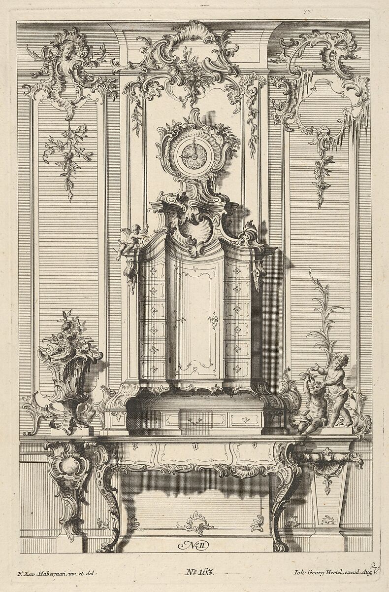 Wall elevation in Rococo style with a secretaire in the center. The secretaire is crowned by a clock and is flanked by pedestals. The one on the left carries a vase, while on the one on the right two putti are placed.