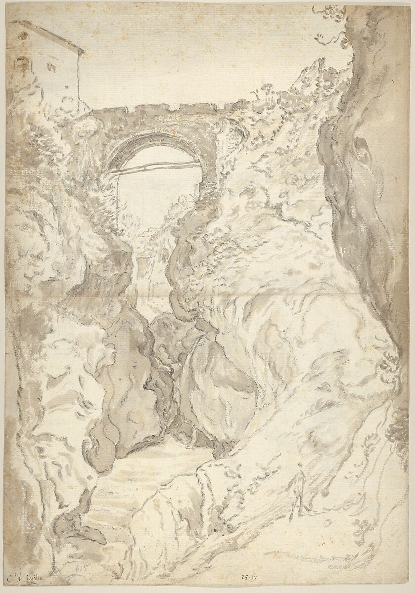 - Title: View of the Ponte San Rocco at Tivoli; verso: Buildings on the River Aniene near Tivoli (?)