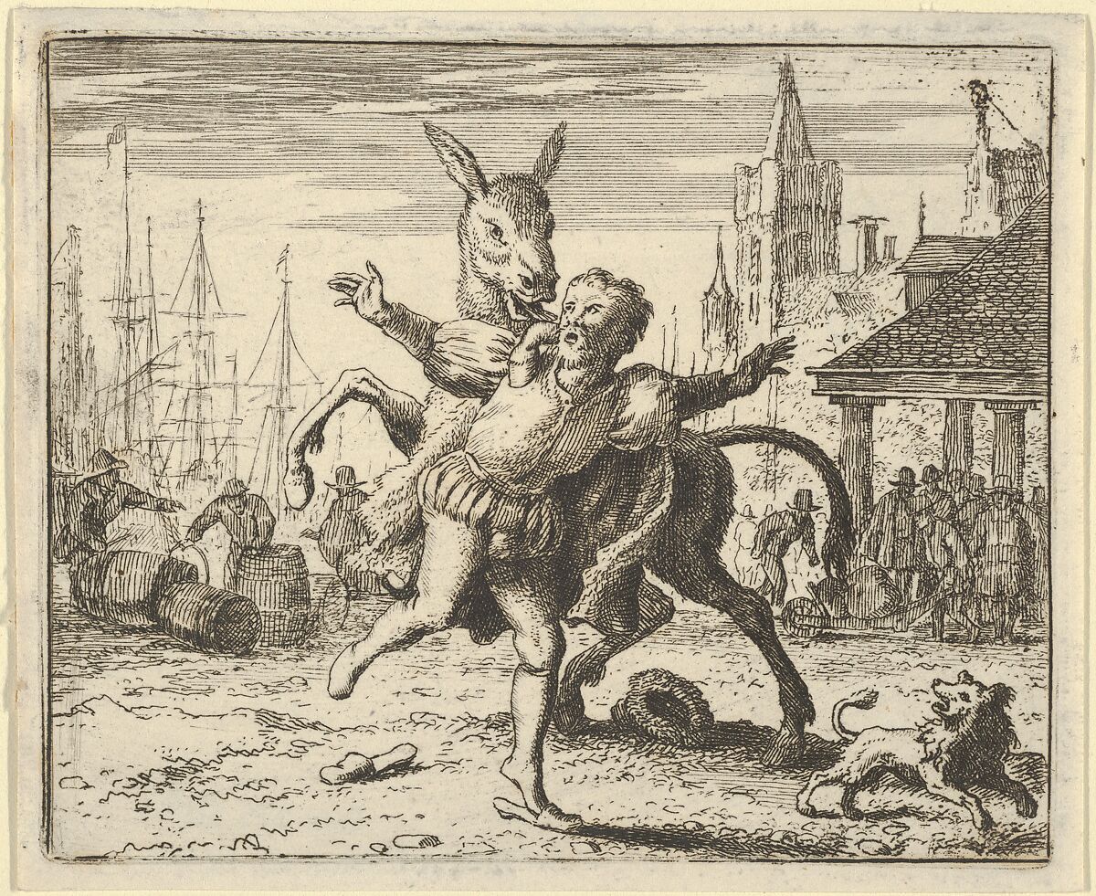- Title: The Ass, Jealous of the Attention the Dog Is Getting From His Master, Looks to Imitate Him by Jumping at the Master's Neck from Hendrick van Alcmar's Renard The Fox
