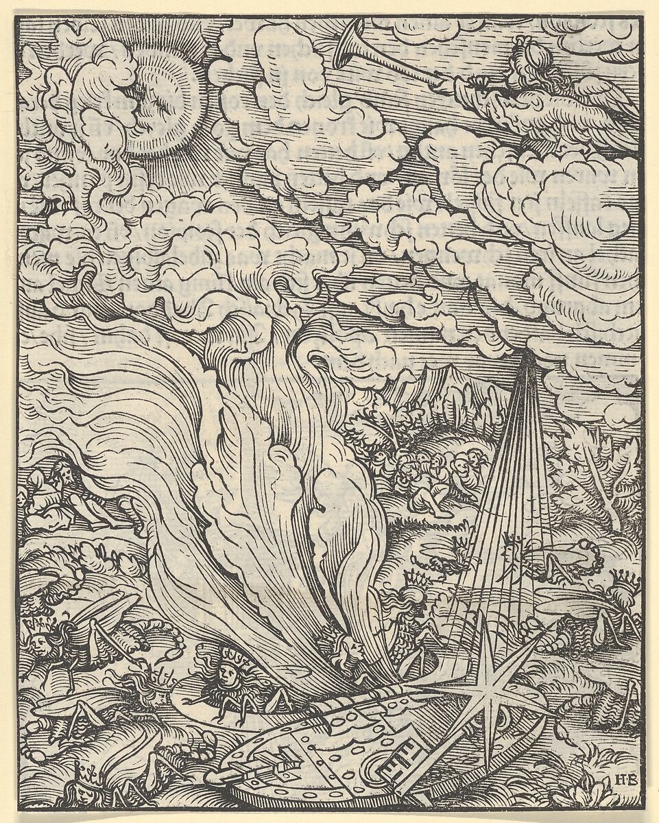 Plate 8 from a series of 21 woodcuts with scenes from the Apocalypse for Martin Luther's translation of the New Testament. Four editions were published in Augsburg by Silvan Otmar between March 1523 and April 1524.