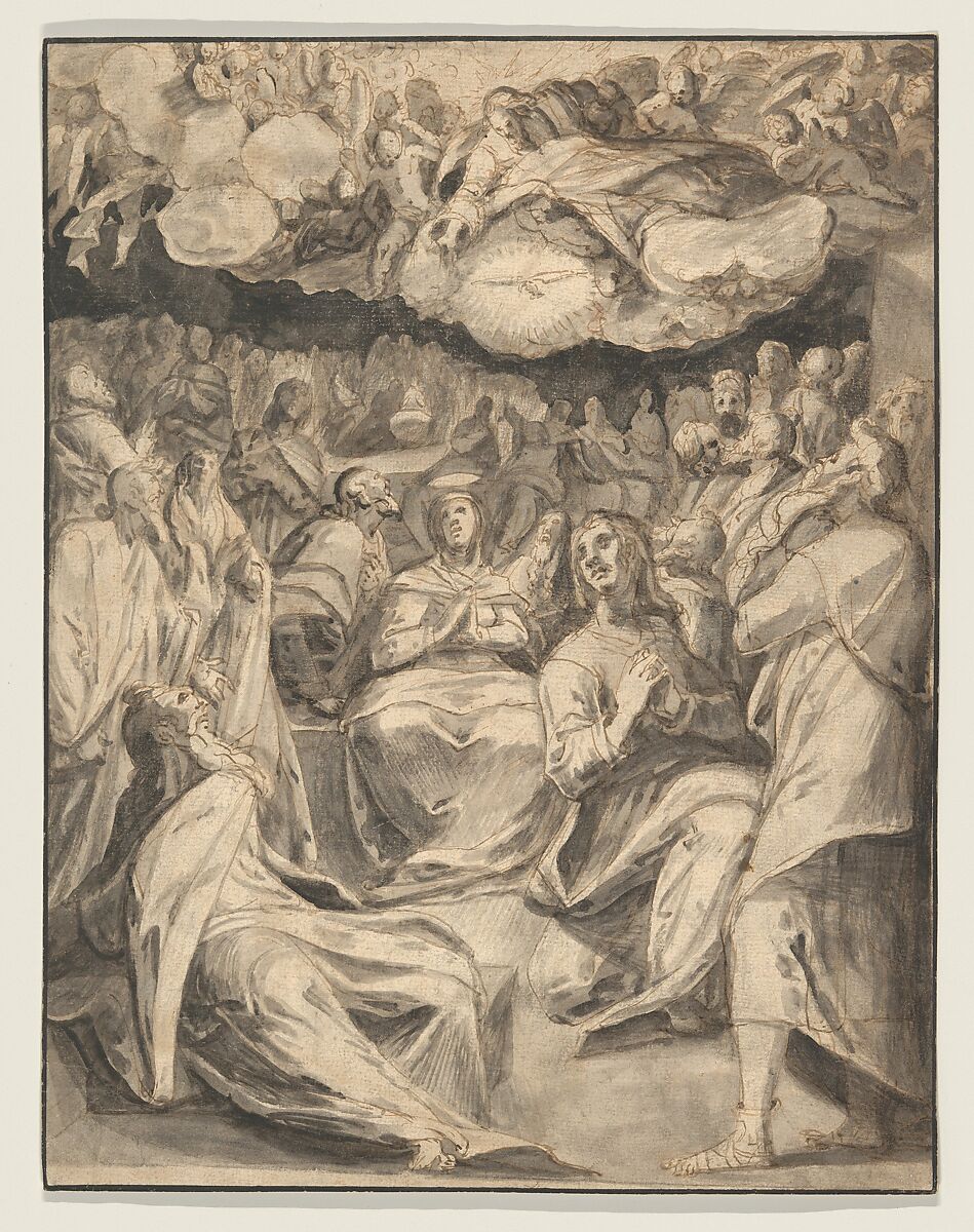 This large drawing of the Pentecost—the appearance of the Holy Spirit to Christ’s disciples after his Ascension, described in Chapter Two of the New Testament book Acts of the Apostles—exhibits the distinctive draftsmanship of the Master of the Egmont Albums, so named for a group of drawings in the Yale University Art Gallery formerly in the collection of John Percival, first Earl of Egmont (1683-1748). The densely packed composition and expressive figures—hallmarks of this artist's work—in combination with the intense contrast of light and dark achieved with a painterly application of ink, heighten the drama of the scene. A very similar drawing, with nearly the exact same dimensions, depicting Christ’s Resurrection was acquired in 2012 by the Ecole des Beaux-Arts in Paris (inv. EBA 8429). The two works may have belonged to a larger Passion series.