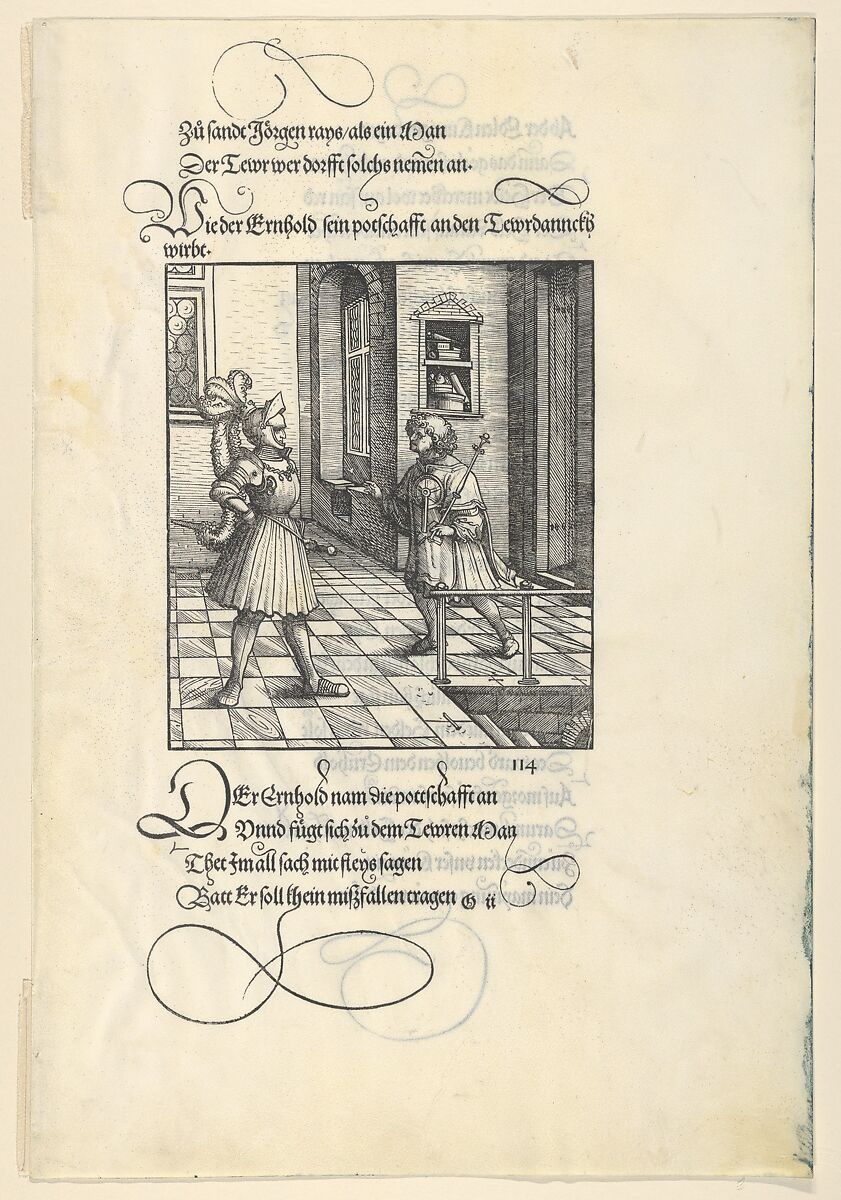 - Title: Ehrenhold Delivering Ehrenreich's Message to Theuerdank, from [Theuerdank] Die geuerlicheiten vnd einsteils der geschichten des loblichen streytparen vnd hochberümbten helds vnd Ritters herr Tewrdannckhs