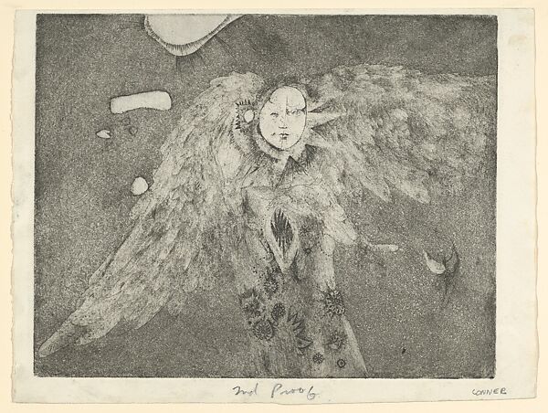 As a group, the state proofs for GERYON reveal Conner's process of refining an image of a character from Dante’s Inferno. In the epic poem, Geryon is a demon whose radiant, jewel-encrusted form disguises his reptilian body, symbolic of his deceitful nature. The state proofs provide insight into Conner’s gradual obscuring of the figure’s wings, which are visible in early states, and the emphasis he later placed on the black background, which amplifies the subject’s luminosity.