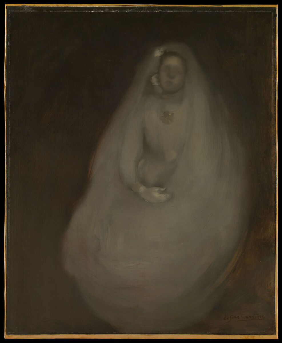 The first communion marks a child's initiation into the Christian Eucharist, the ritual consumption of consecrated bread and wine. Carrière's muted palette, fluid brushwork, and simplified forms lend an otherworldly aspect to the girl, enveloped in her white communion gown and veil. This painting and several others on the same subject have been associated with a religious triptych that the artist created about 1897 (current location unknown).