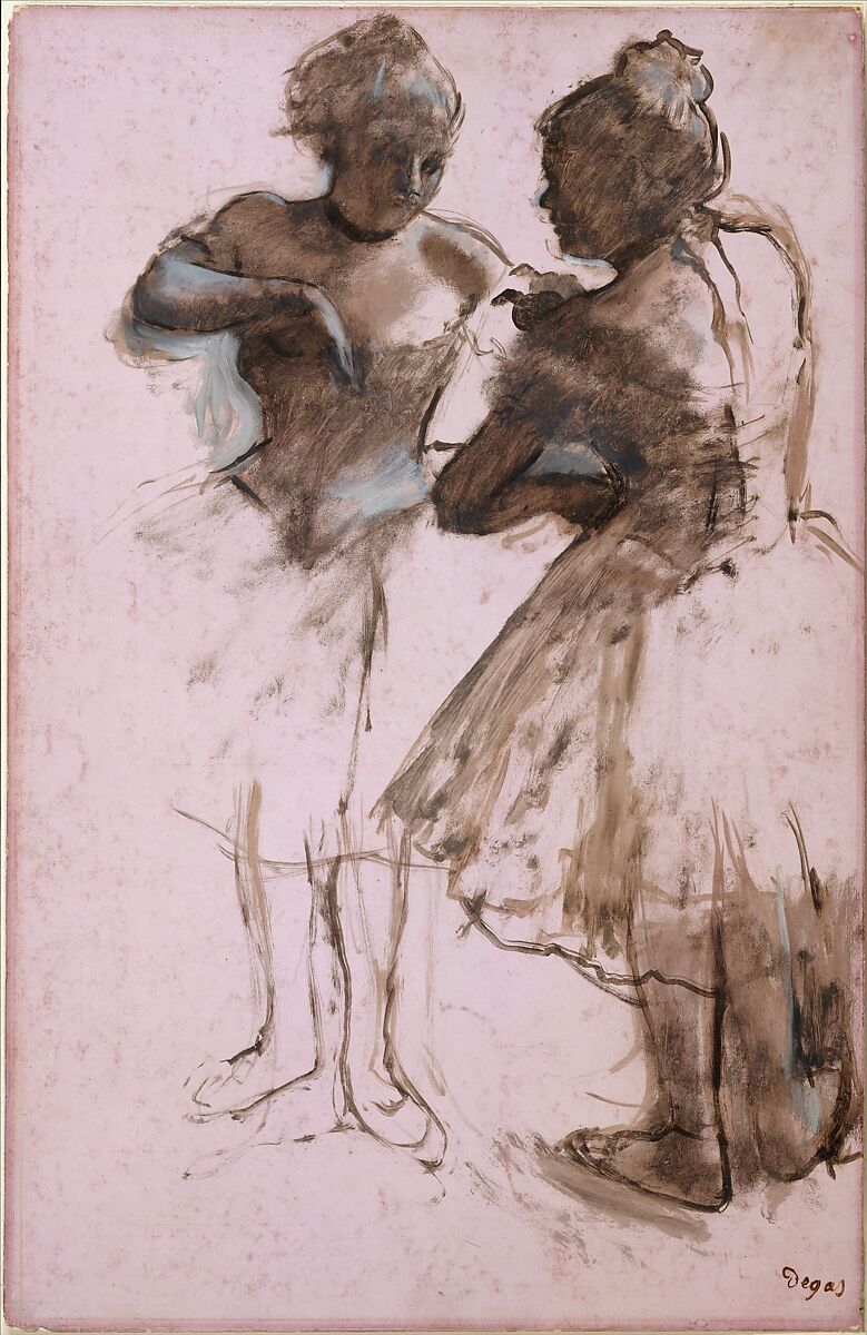 This freely brushed drawing belongs to the stock of figure studies Degas executed in sepia wash on colored papers for his great rehearsal pictures of the mid-1870s. The dancers are posed to the left and right of the ballet master in The Dance Class (Musée d'Orsay, Paris), begun in 1873, and the one at right also appears, looking into a mirror, in The Met's version of 1874 (1987.47.1).