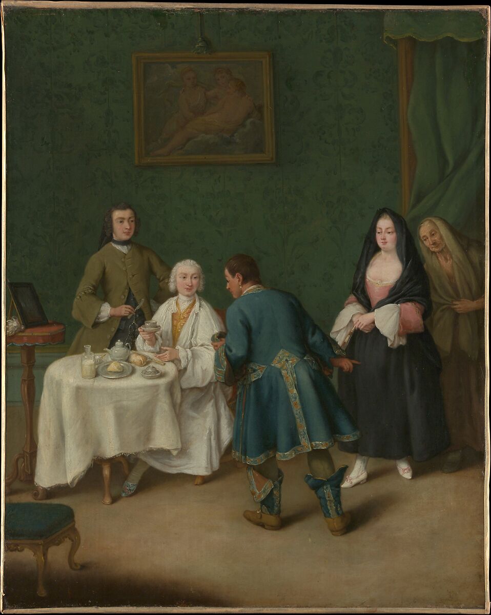 With remarkable frankness, the arrival of a sex worker and her procuress is announced to a gentleman wearing a dressing gown at his breakfast table. A second cup and saucer suggest that he has anticipated her visit. The intermediary male figure’s ostentatious dress seems not to be Venetian, though his identity remains uncertain. As often in Longhi’s compositions, a painting within the painting—here an erotic mythological subject—clarifies the actions about to take place.