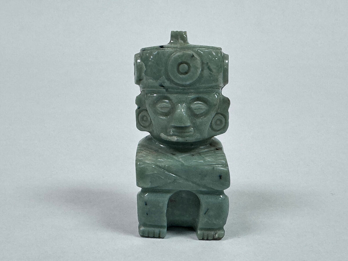 Carefully carved and polished from hard greenstone, this small figure sits in quiet repose with crossed arms resting atop its bent knees. This, and similar figures belong to a long-established lapidary tradition found across Mesoamerica known as penates. Derived from Latin to describe household deities, penates are likely manifestations of ancestors — their stiffened posture resembling a burial position for the deceased.