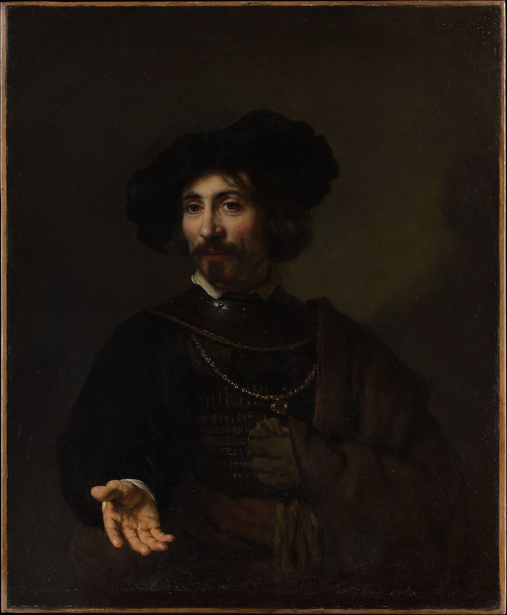 Rembrandt's authorship was doubted as early as the 1920s. In subject and style the painting is typical of the master's immediate circle in the 1640s; attributions to Govert Flinck and to Gerbrand van den Eeckhout, both of whom studied under Rembrandt in the 1630s, have been proposed in recent years. The dashing figure's gesture may have been adopted from that of the captain in The Night Watch of 1642.
