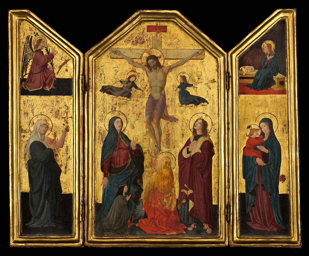 Uccello is best known for his battle scenes for the Medici palace and for frescoes in the cloister of Santa Maria Novella, Florence; however, he also painted small devotional panels. This portable triptych includes the depiction of a nun of the Brigitine order at the foot of the cross, identified by an inscription as Sister Felicity (possibly Felicita di Francesco Casavecchia, who joined the order in January 1455, which is about the date of the painting). The triptych was painted for her private devotions in her cell at the Brigitine convent of Santa Maria del Paradiso near Florence.
