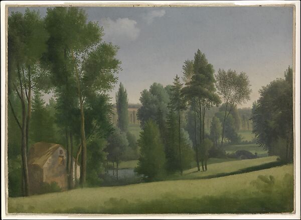 In the first decade of the nineteenth century, Dunouy received numerous commissions to paint views of country estates within a short distance of Paris. Since the eighteenth century, châteaux including Ermenonville, Malmaison, Montmorency, Mortefontaine, and Saint-Cloud had all acquired parks in the informal, English style seen in this sketch. The English in their turn had drawn inspiration for their private parks from the arcadian paintings of seventeenth-century French artists working in Italy, such as Nicolas Poussin and Claude Lorrain.