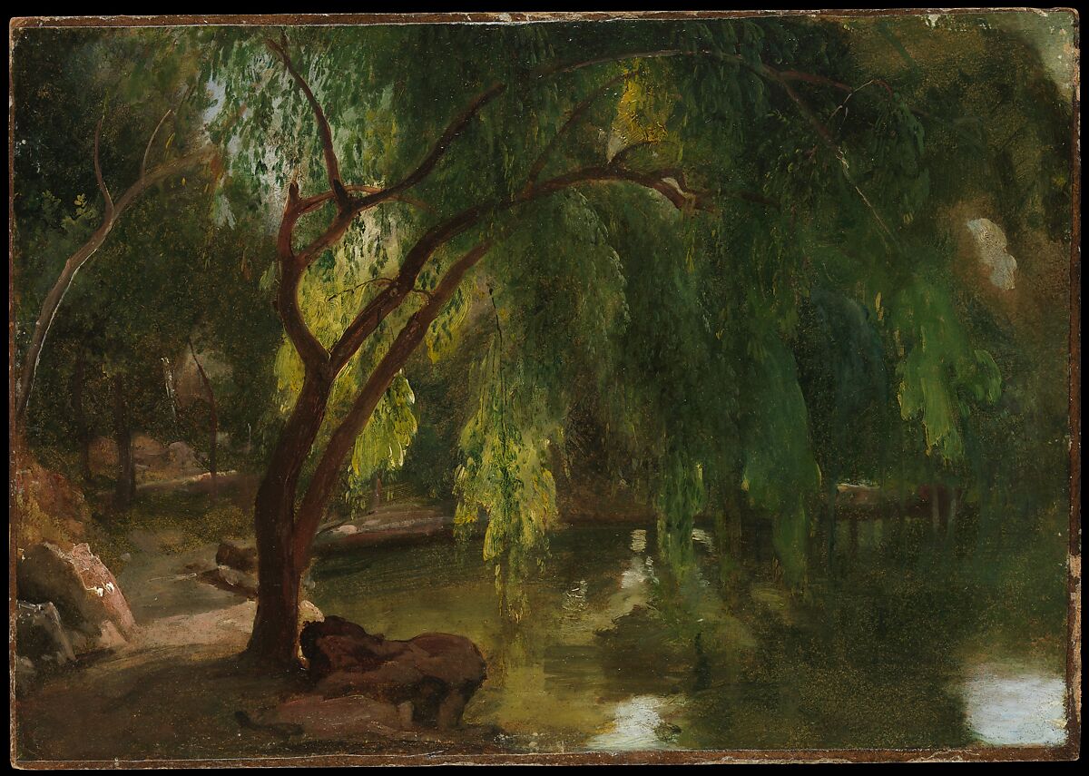 Blechen painted this sketch in the largest public park in Berlin. Different combinations of light, foliage, and water prompted him to vary his brushwork, which is especially lively where the tips of the branches alternate with reflections on the pond's surface. The artist’s appreciation for the spontaneity of sketching out of doors was galvanized by his encounter with Johan Christian Dahl, whom he met in Dresden in 1823.
