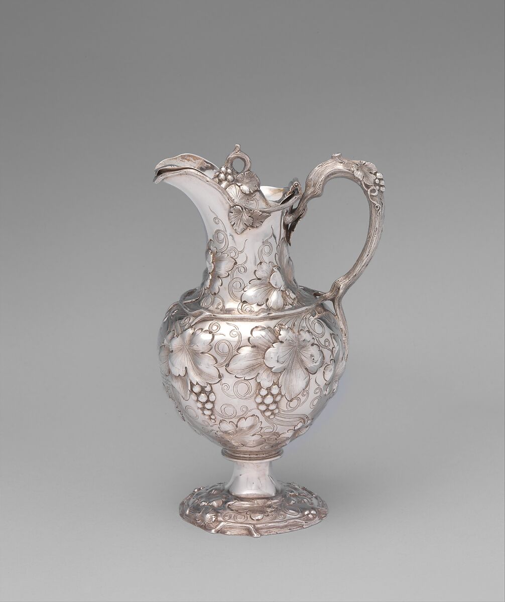 In 1850, Marshall Lefferts, president of the New York and New England and the New York State telegraph companies, was presented with "a splendid service of plate" to honor his construction of telegraph lines from New York to Boston and Buffalo. It was designed by John C. Moore in the "modern French" style, with floral chasing and rusticated castings. Surmounting the kettle is a figure of Zeus holding lightning bolts—an allegory of electricity.