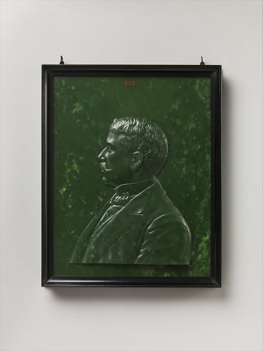 The carving is among the refined works that Bishop commissioned from famed French and Russian gemstone artists of his time. Most notable is his portrait; depicted in raised relief on a panel of deep green nephrite, it attests to his passion for both natural materials and art.