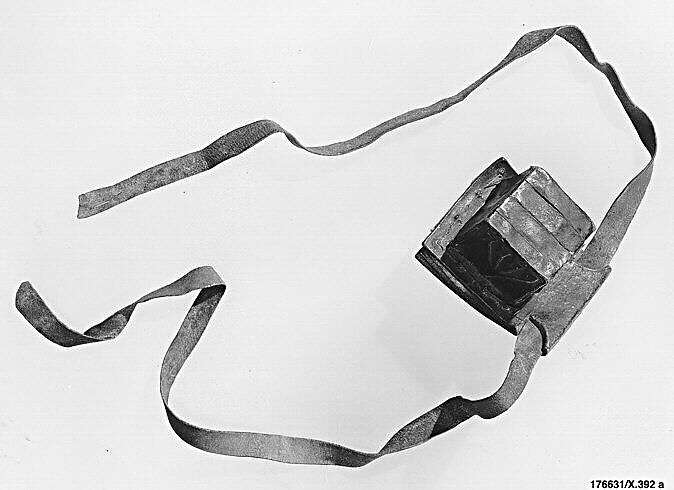 The Hebrew word tefillin designates a pair of small leather boxes containing parchment inscribed with verses from the Torah (Exod 13:1-10;13:11-16; Deut 6:4-9; 11:13-21). A Jewish ceremonial object whose form is explicitly prescribed by Jewish law, tefillin are traditionally worn by Jewish men on the forehead and on the upper arm and hand during weekday morning prayers. This set of tefillin is incomplete, preserving only the "head-tefillin" and not the "hand-tefillin." The form and ritual use of tefillin has remained largely consistent for over 2,000 years. The earliest known tefillin cases and tefillin parchments were discovered amongst the Dead Sea Scrolls (300 BCE–70CE) in the caves of Qumran and elsewhere in the Judean Desert. Additional tefillin were discovered among the fragments of the Cairo Geniza.