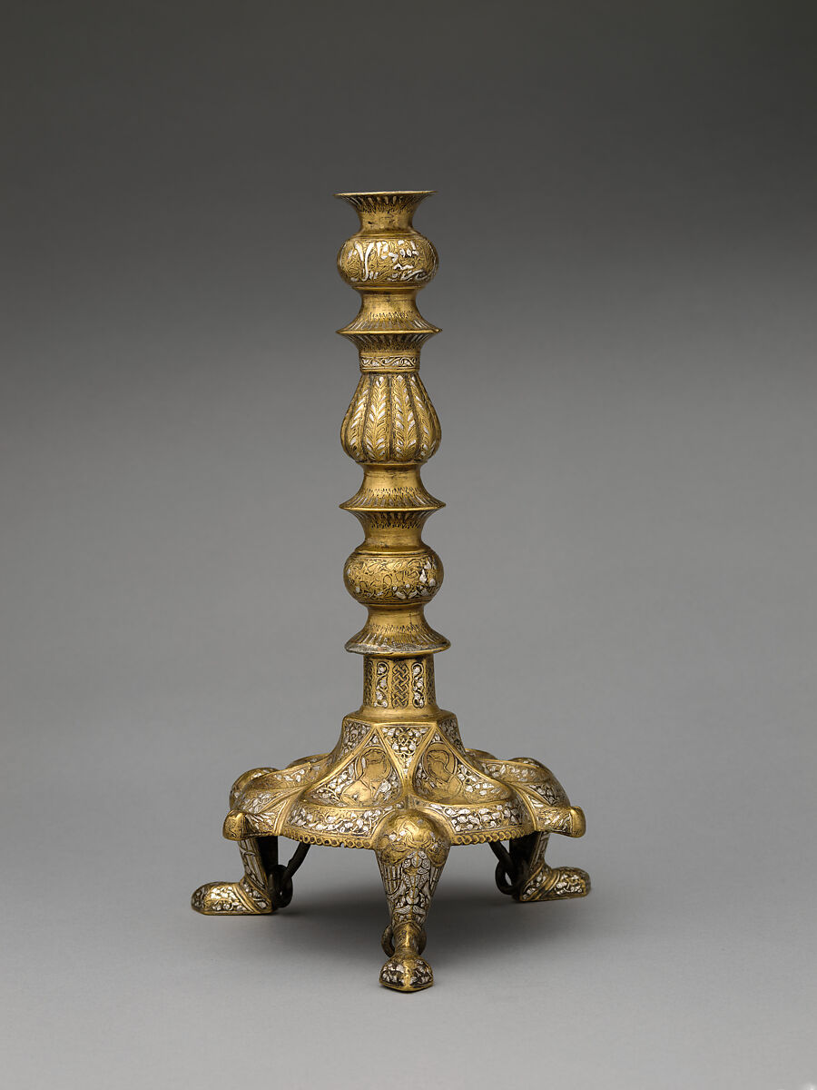 The engaging profile on the stem is composed of three distinct superimposed elements, perhaps flower vases or mosque lanterns. This candlestick was made for an affluent Mamluk named Sharaf al-Din 'Abd al-Rahman.