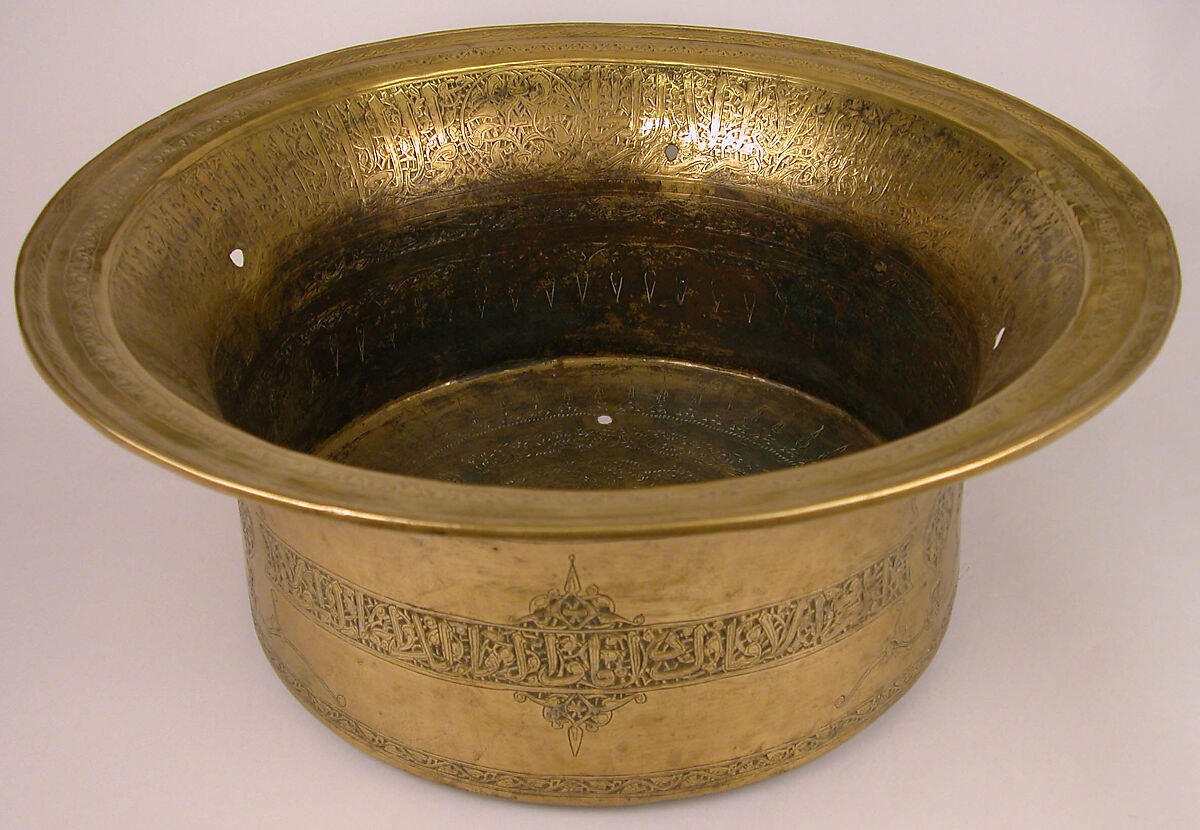 The shape of this basin, both in metal and glass, was popular in the Ayyubid and Mamluk periods. From its elegant profile and inscribed titles it is evident that it was made for an important commander of the Mamluk army.