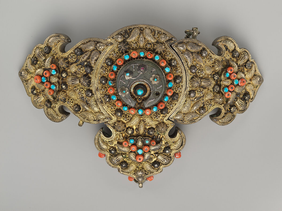 - Medium: Silver sheet; gilt, repoussé, patterned wire, and granulation; inlaid with silicae, coral and turquoise beads filigreed, granulation
