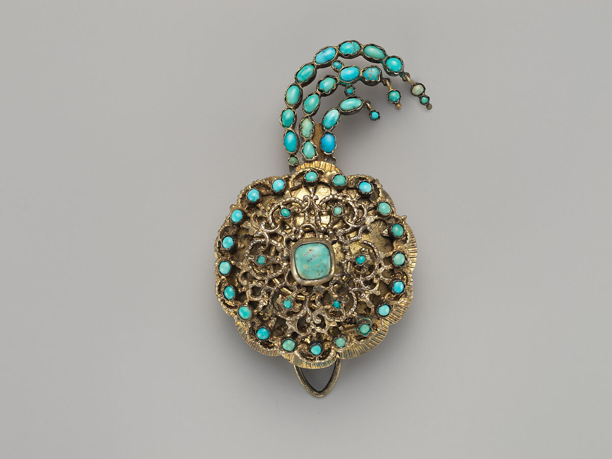 • Medium: Silver sheet; gilded, applied with filigree, inlaid with turquoise