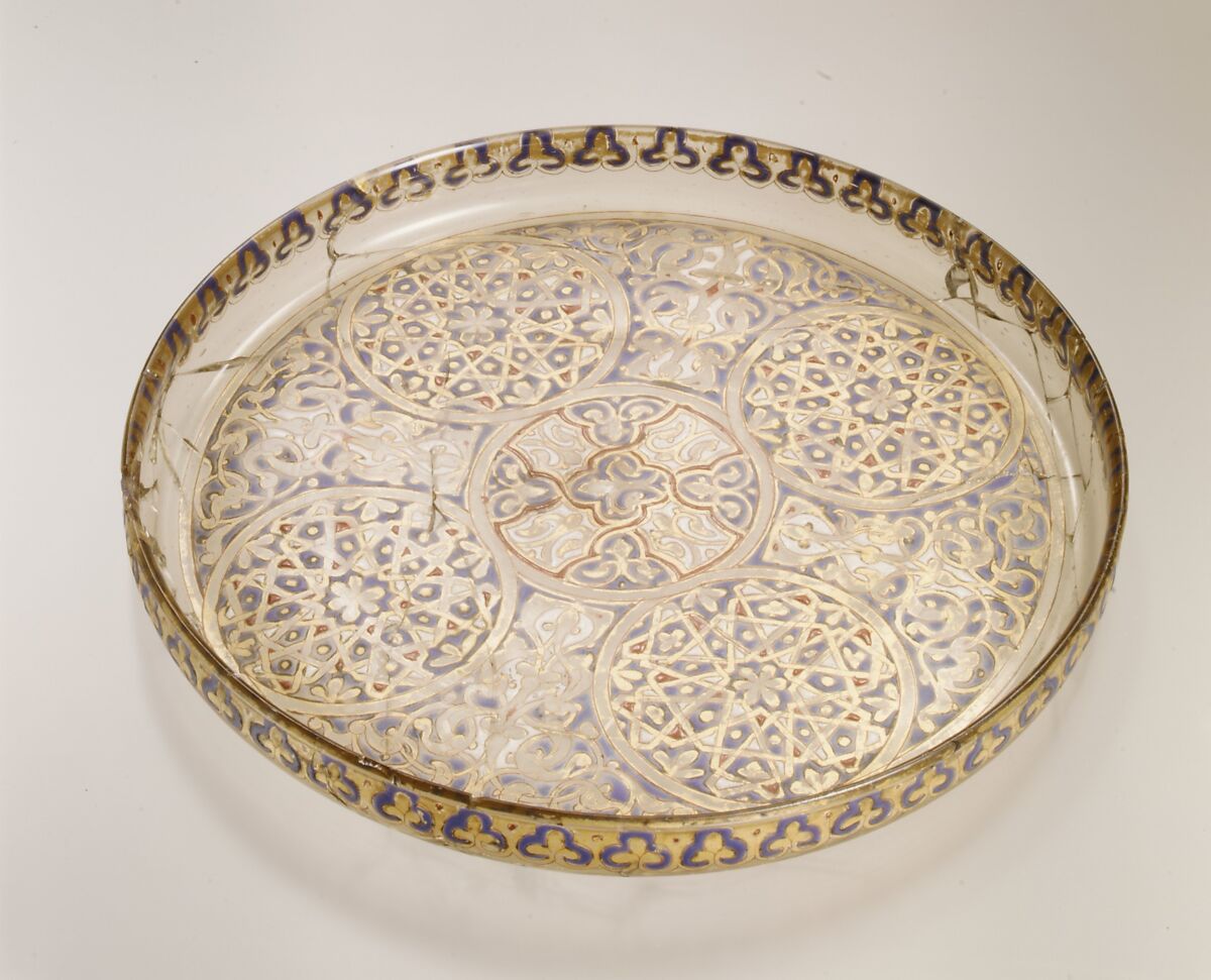 Although flat dishes with raised curved rims, such as this example, were uncommon in Mamluk enameled glass, the dense decoration on this plate is typical of the style of enameled glass of fourteenth century Egypt. A geometric grid created through five tangential circles, drawn in a continuous looping line, dominates the composition. Four of the circles include a complex interlacing star-like pattern, and alternate with stylized arabesque-type vegetal patterns. The colorful chromatic contrast of blue, white, and red enamels, as well as gilding emphasizes the graphic quality of this complex design. Such luxurious dishes belonged to the luxurious tableware used by the ruling elite in regions between Egypt and Anatolia.