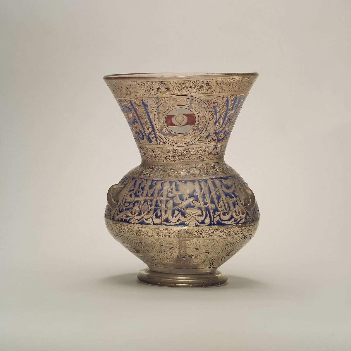 ELLEN KENNY: In this case we're looking at a series of what we call mosque lamps. These lamps were generally suspended from the ceiling with long metal chains. And inside they would have been fitted with a saucer that held oil, and water and a floating wick. These would have provided light, but they also would have created… a fabulous atmosphere with all of these dimly lit lamps in rows. There would have been many of them in any one context. Technically, the art of enameled glass is one of the areas… where Mamluk art really excelled. It was quite a feat not only to blow these big forms, but also to decorate them with enamels that needed to be reheated. And not all of the enamels would adhere at the same temperature, so this had to be done over and over depending on how complicated the piece was. So you‘ll see a sort of progression. In some of the later pieces you can see… more ambitious designs. Mosque lamps are a really good place for us to see calligraphic decoration really coming to the forefront. And very often they contain a particular verse from the Qur'an, that we call the Light Verse. And this is a verse which emphasizes the presence of God, and His luminous presence.