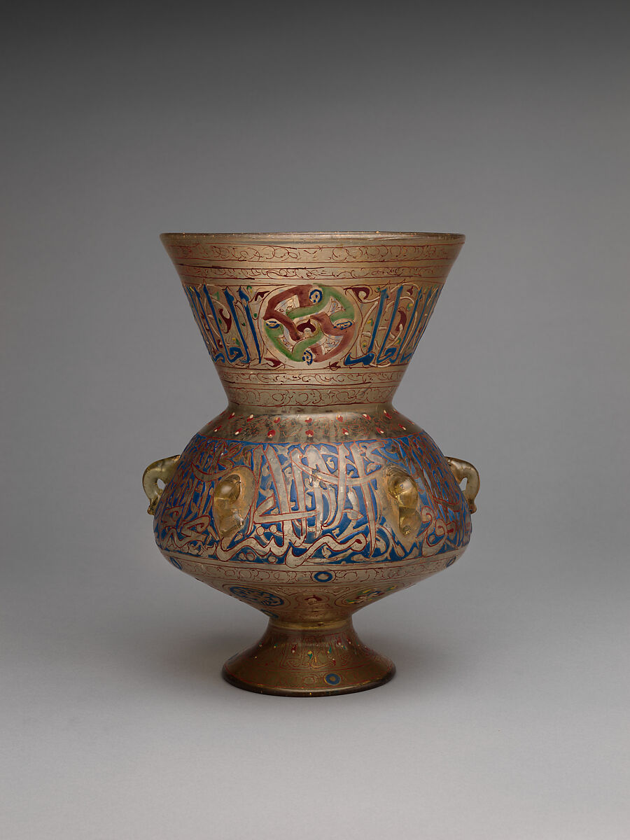 One of the conventions of Mamluk mosque lamp decoration was to execute one inscription band in blue and the other in reserve against a blue ground. On this lamp, the neck and foot repeat the phrase al‑'alim ("The Wise"), punctuated by an as yet unassigned emblem, while the body bears a formulaic dedicatory inscription but no name.