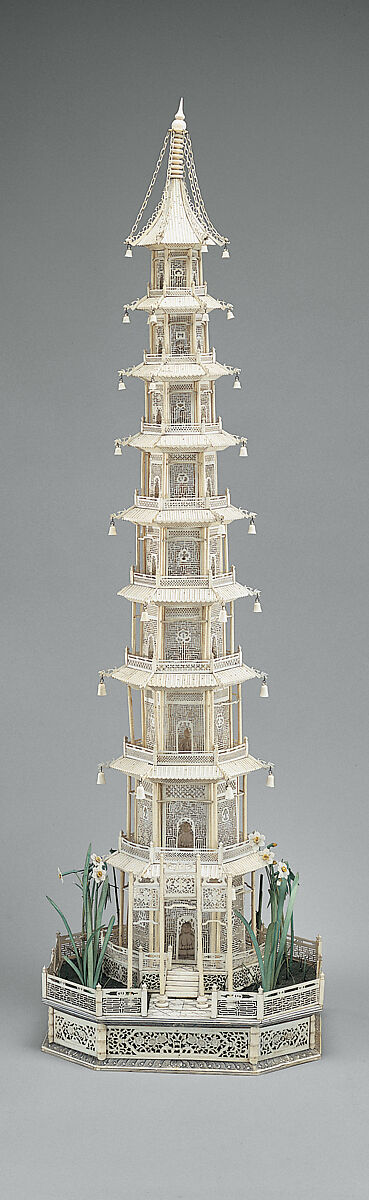 NARRATOR: Henry Wadsworth Longfellow, in his 1878 world-traveling poem “Kéramos,” describes Nankin’s famous nine-story Porcelain Pagoda, now destroyed. This wonder of the medieval world stoked Westerners’ imaginations about China’s great, ancient civilization. This model of that pagoda is a wonder, the ivory carved with exceeding delicacy in floral and geometric patterns.