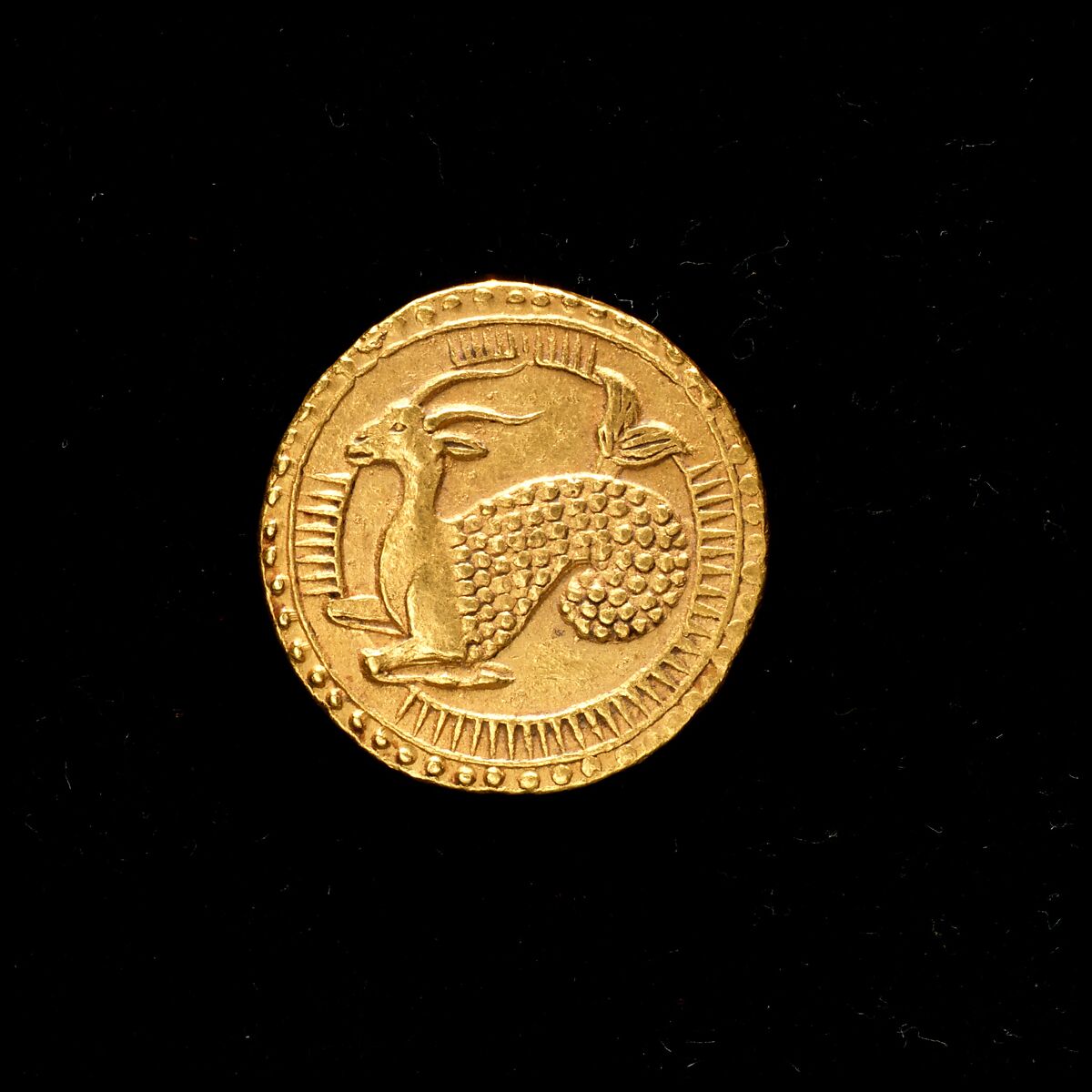 Bearing signs of the zodiac, the coins conceived of and issued by Emperor Jahangir were a development of earlier Mughal coinage, which included religious calligraphic inscriptions and minting dates. The sign of Capricorn corresponds to the month in which this coin was issued, while a couplet on the reverse provides additional information about the reign and year.