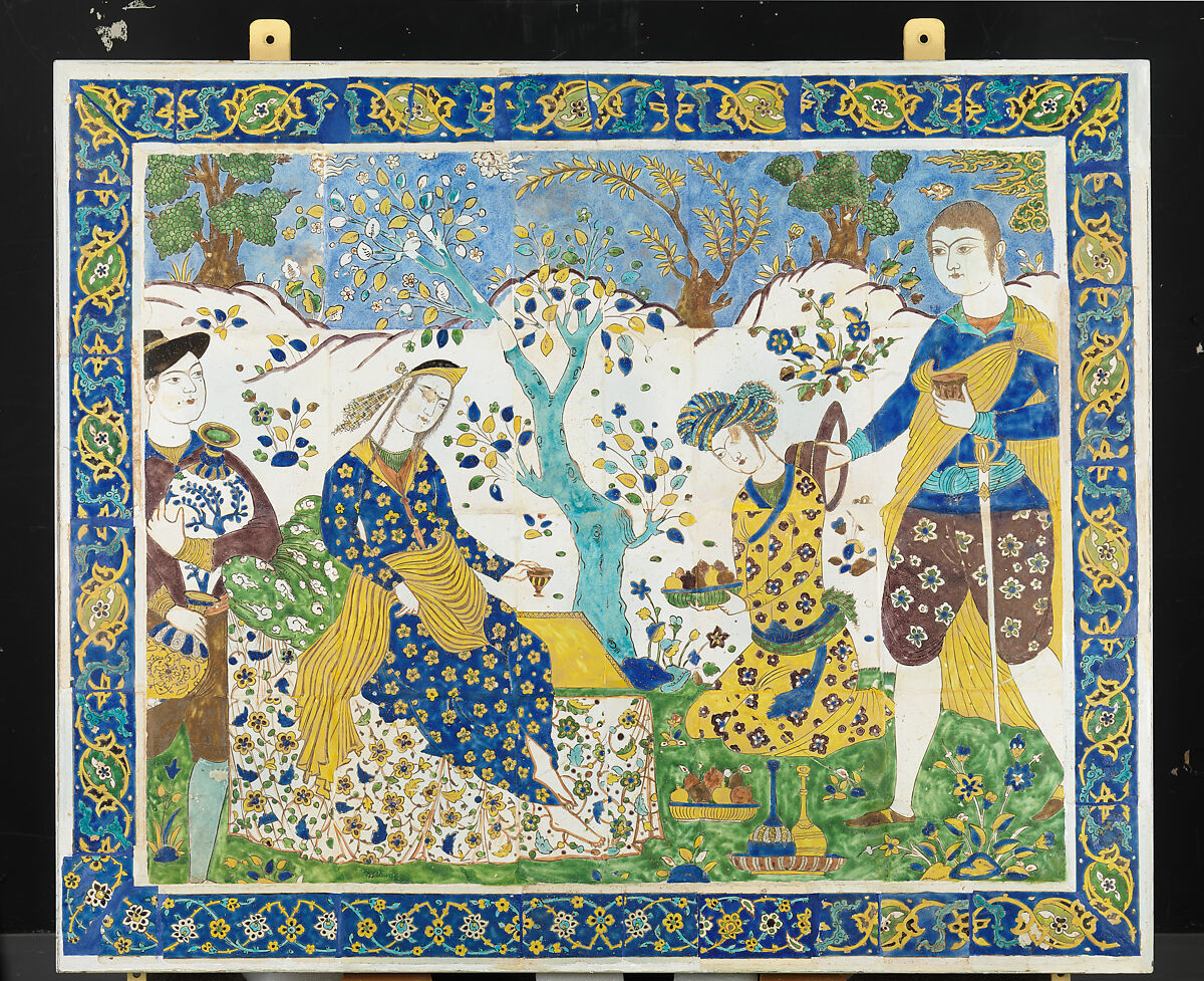 Isfahan, the Safavid capital, and Na'in were the two main centers in which buildings were lavishly decorated with tilework. The old tile-making tradition of composing repetitive geometrical or vegetal patterns was kept alive on mosques and madrasas, but an important innovation on secular buildings was a composition of square tiles individually painted as single elements of an outdoor scene with characters set in a garden landscape. These were placed in royal garden pavilions from the time of Shah 'Abbas to that of Shah Sulayman (the last example being the Hasht Bihisht of 1669). The Museum owns three of these panels, all purchased in 1903 and reported to come from "a palace and pavilion built by Shah 'Abbas on the garden avenue of the Chahar Bagh at Isfahan." The panel here shows a woman and three men in the garden. Such scenes were among the most frequent and fashionable subjects chosen by miniature painters of the Safavid period.