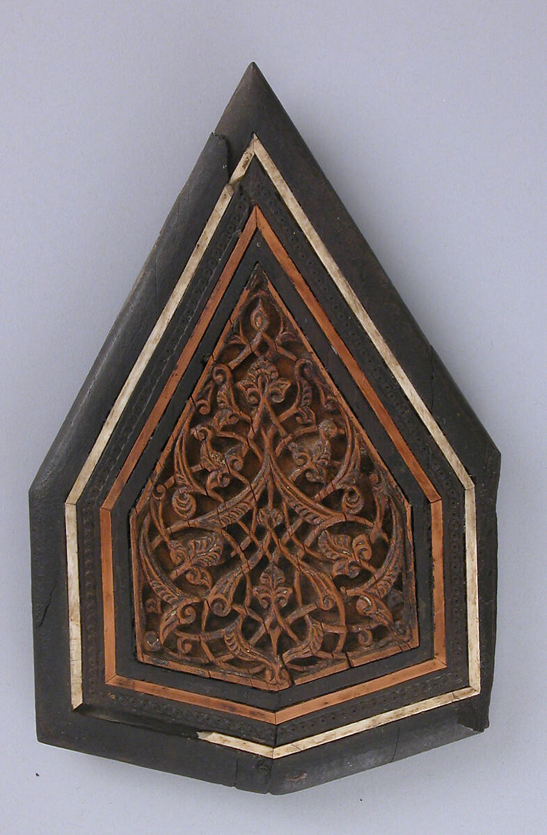 Although the pattern of this group of panels appeared as early as the late twelfth century in Azerbaijan and is recorded as late as 1480–81, it enjoyed a particular vogue in Cairo between 1330 and 1350. A number of minbars in Cairo with this pattern and from this period bear very close resemblance to these pieces.