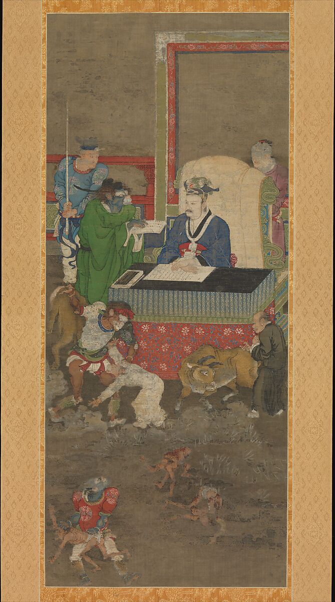 This is one from a set of scrolls (30.76.290–.294) illustrating the theme of the Ten Kings of Hell, which developed during the second half of the Tang dynasty (618–907). The theme transforms the Indian Buddhist view of judgment after death into a typically Chinese bureaucratic process. Before being permitted to transmigrate into the next life, a soul is tried by a different king each week for seven weeks; it is sent to the eighth king on the hundredth day, to the ninth after a year, and to the tenth the third year after death. Here, each scroll shows a king—assisted by a scribe and other officials—examining and passing sentence on the souls of the dead; in the foreground demons punish the wicked.