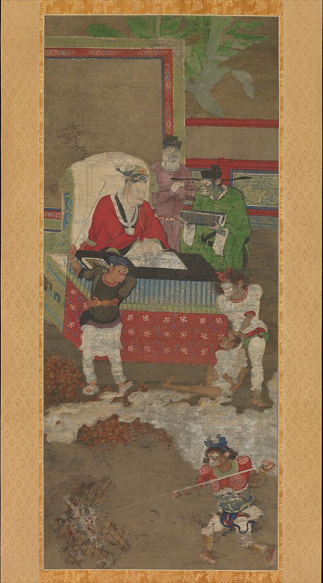 This is one from a set of scrolls (30.76.290–.294) illustrating the theme of the Ten Kings of Hell, which developed during the second half of the Tang dynasty (618–907). The theme transforms the Indian Buddhist view of judgment after death into a typically Chinese bureaucratic process. Before being permitted to transmigrate into the next life, a soul is tried by a different king each week for seven weeks; it is sent to the eighth king on the hundredth day, to the ninth after a year, and to the tenth the third year after death. Here, each scroll shows a king-assisted by a scribe and other officials-examining and passing sentence on the souls of the dead; in the foreground demons punish the wicked.