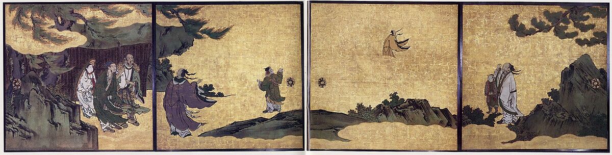 These panels depict Daoist immortal Liezi (Japanese: Resshi), who flies away on a cloud, while awestruck figures discuss his mysterious disappearance. These door panels, or fusuma, originally decorated the west wall in the central room of the abbot’s quarters (hōjō) at Ryōanji, a Zen temple in Kyoto. They are part of a set of forty panels depicting assorted Confucian and Daoist figures that were installed in the three rooms.