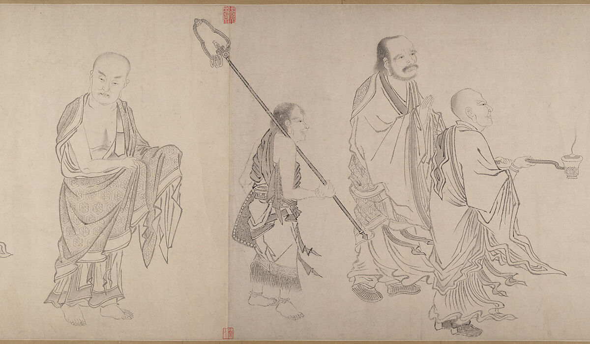 Best known for his paintings rendered in brilliant mineral colors, Qiu Ying sometimes worked in ink alone to demonstrate his skill as a draftsman. In this dynamic procession of luohans and their attendants, the figures are enlivened through exquisitely controlled, undulating and folded brush lines and luminous graded washes. Qiu's enthusiasm for detail is evident in the remarkable individualization of the holy men's eccentric features and the delicate textile designs of their robes. Although the artist's inscription credits the monk-artist Guanxiu (832–912) as the source of his inspiration, the ninth-century master's grotesque luohans have here been replaced by elegant Sinicized ascetics.