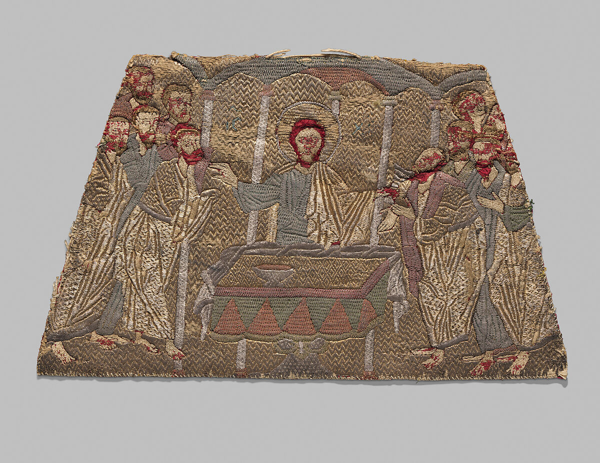 The similar embroidered scenes on this cuff and on #10.168.1 show Christ standing at an altar as he administers the bread and wine of Communion to the assembled Apostles. Priests or bishops wore such epimanika when distributing Communion, thus imitating Christ's actions. The cuff now lacks its border, which likely contained inscriptions relating to the imagery.