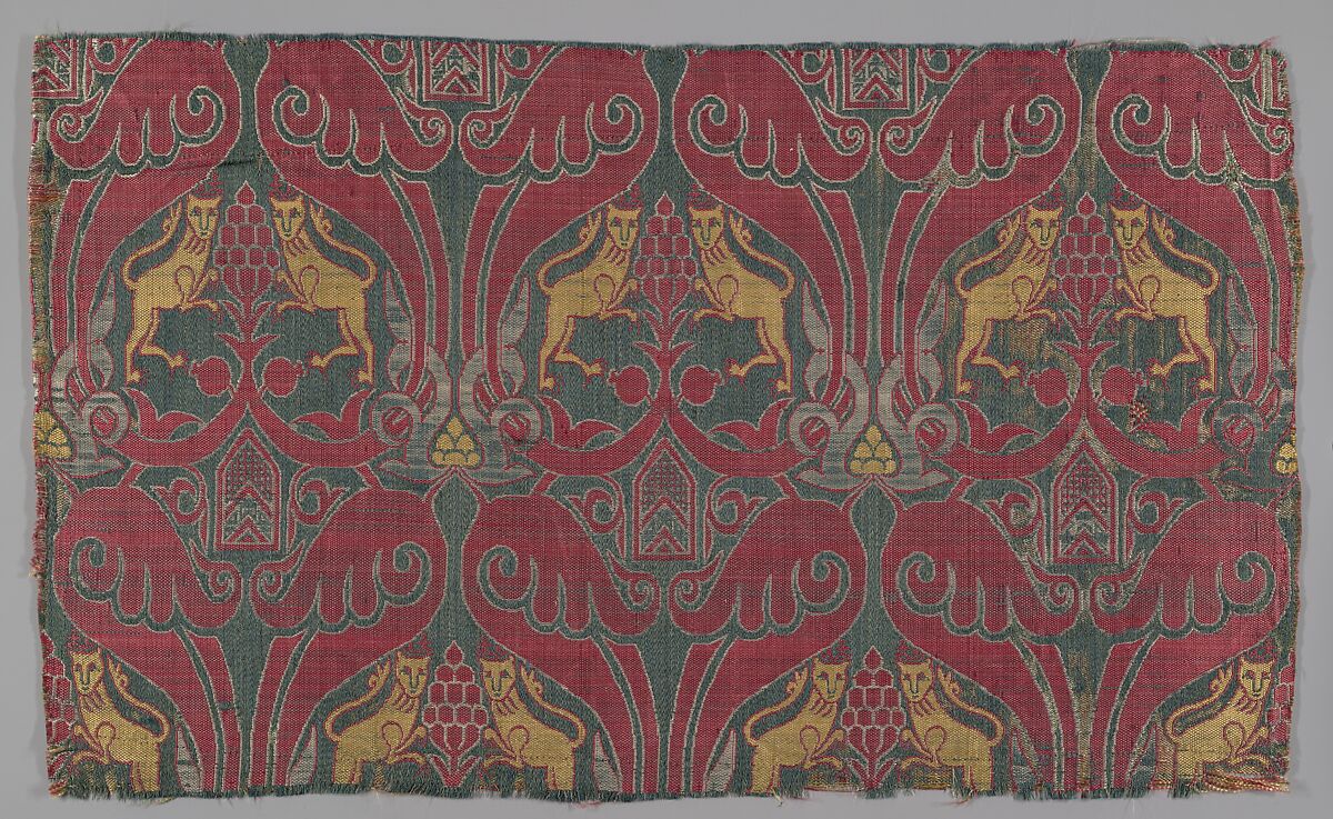 This silk textile shows pairs of confronting lions on either side of a stylized tree, enclosed by swooping crimson-colored split palmette leaves and set against a green ground. The lions have been compared to a Granadine textile bearing Nasrid heraldic emblems and rampant lions, which possibly served as the model. Variants of this pattern, depicting slightly different plant forms or animals illustrate that these textiles were mass-produced. For similar textiles in the museum’s collection, see also 25.120.453, 20.94.1, and 1981.372.