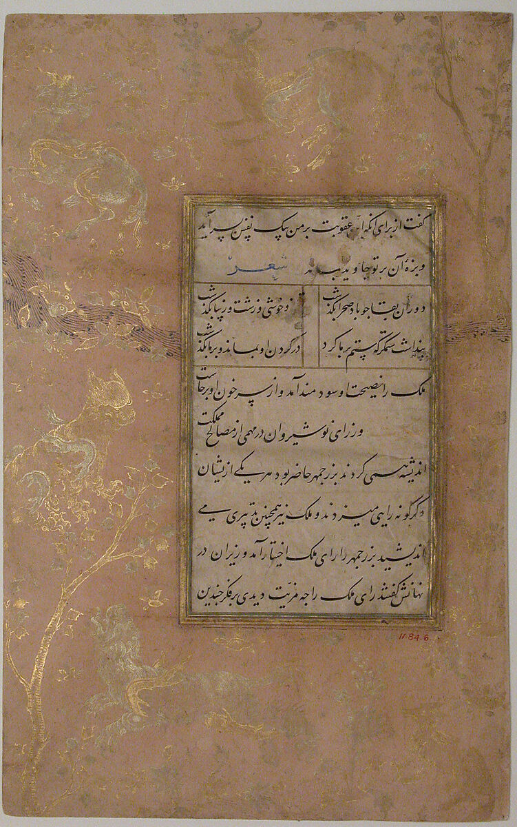 This leaf comes from a dispersed anthology of Persian poetry. The leaves were remounted with borders painted in gold and silver on colored grounds - most commonly dark blue or salmon pink. The border designs range from a medley of animals, both real and fantastic - the latter borrowed from a Chinese repertory - amidst trees, foliage and rocks to those containing human figures engaged in varied active and contemplative pursuits . They are unsurpassed artistically in terms of drawing, coloring, and composition, but above all in their almost transcendental lyricism. They are in a style practiced at the court of Shah Tahmasp at Tabriz and perfected by the painter Sultan Muhammad. The calligrapher Sultan 'Ali Mashhadi, equally renowned, worked at the Timurid court in Herat in the later decades of the fifteenth century. His calligraphy was revered to the point of warranting the addition of the beautiful new borders at a later date.