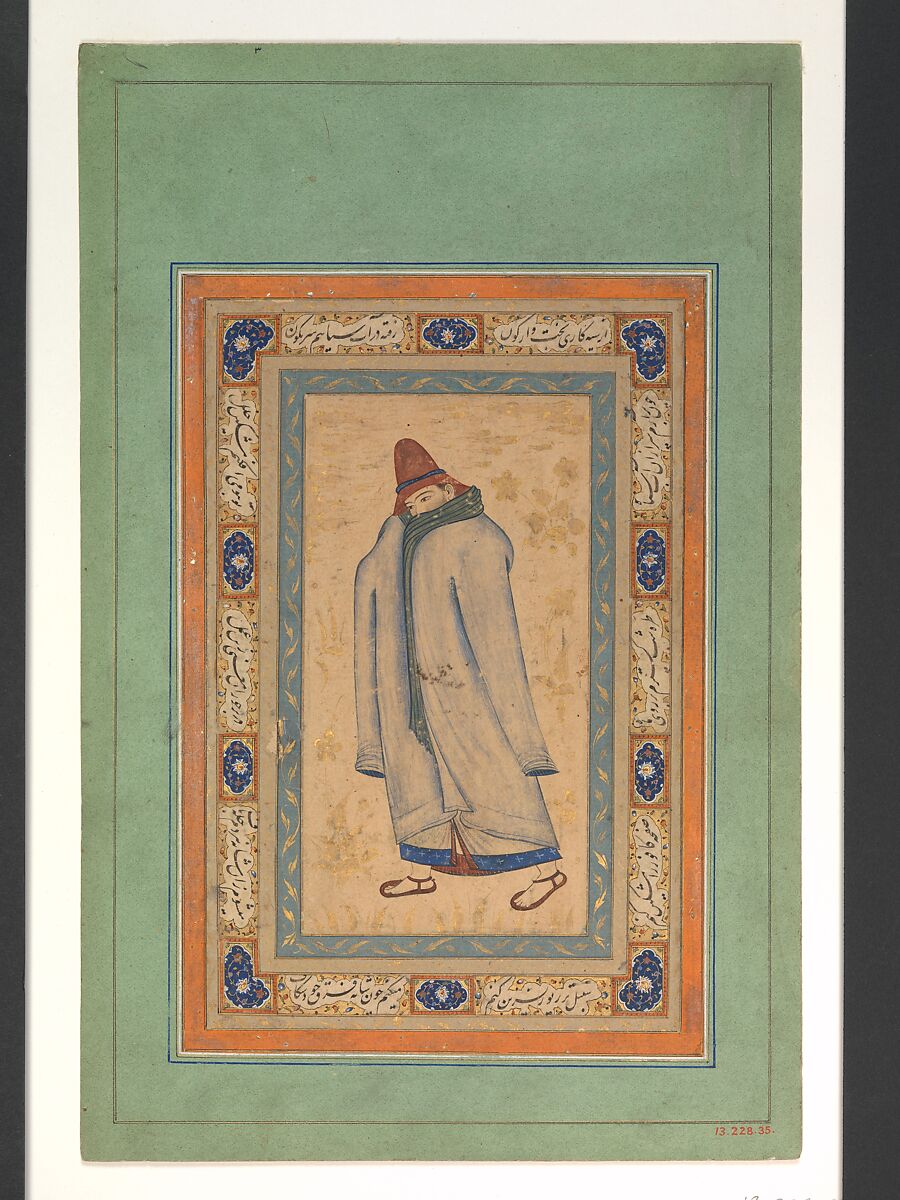 This figure can be identified as a dervish, as he drapes himself in a blue khirqa, a cloak worn by Sufis that is characterized by extremely long sleeves. This garment had special meaning, and was awarded to an aspirant (murid), usually after several years of initiation. The investiture of the khirqa is significant in that it formally recognizes the aspirant as a member of the Sufi order and acknowledges that he is a link in the silsilah (chain) of divine knowledge, originating with the Prophet Muhammad.
