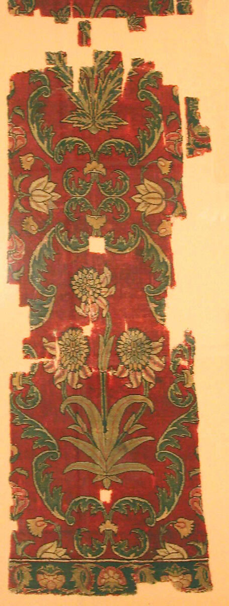 The pile of these fragments is pashmina, or cashmere wool, the hair of Himalayan mountain goats. It was used in the very finest Indian carpets, which were often misidentified until fairly recently as velvets.